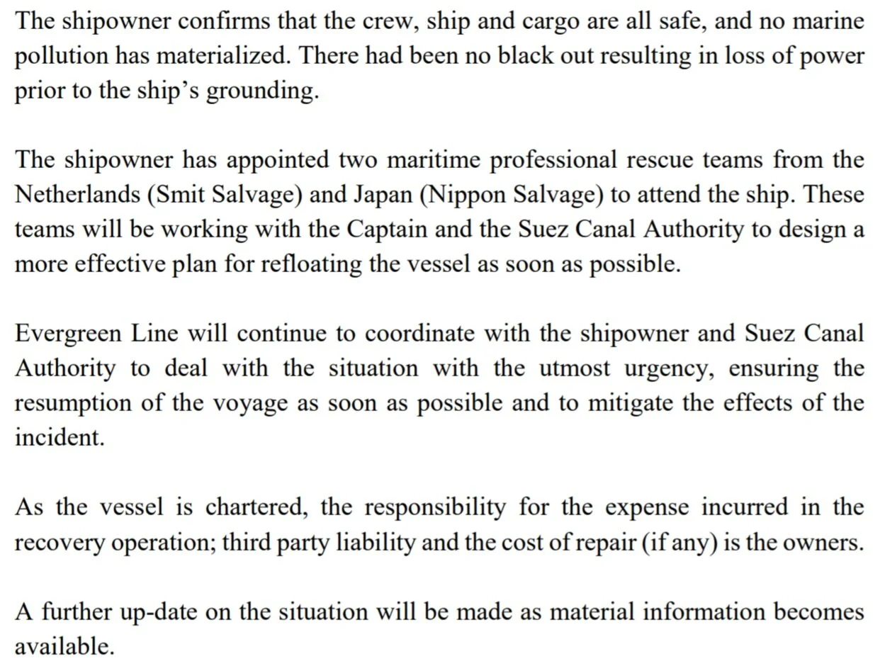Evergreen Marine Corp., the owner of Ever Given, posts updates on the Suez Canal incident on its website here: