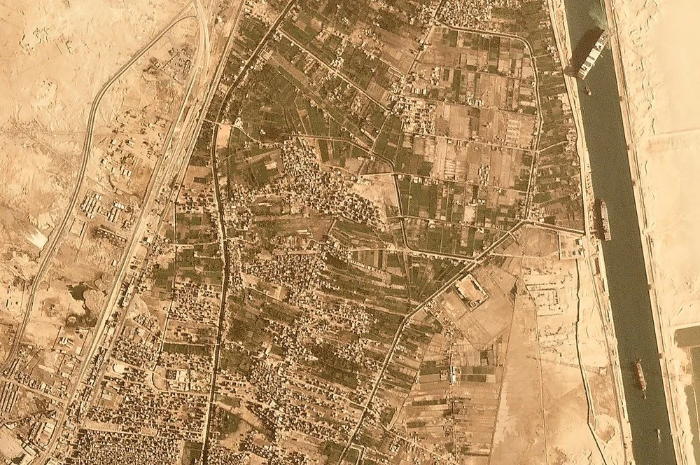 “This satellite image from Cnes2021, Distribution Airbus DS, shows the cargo ship MV Ever Given stuck in the Suez Canal near Suez, Egypt, Thursday, March 25, 2021.