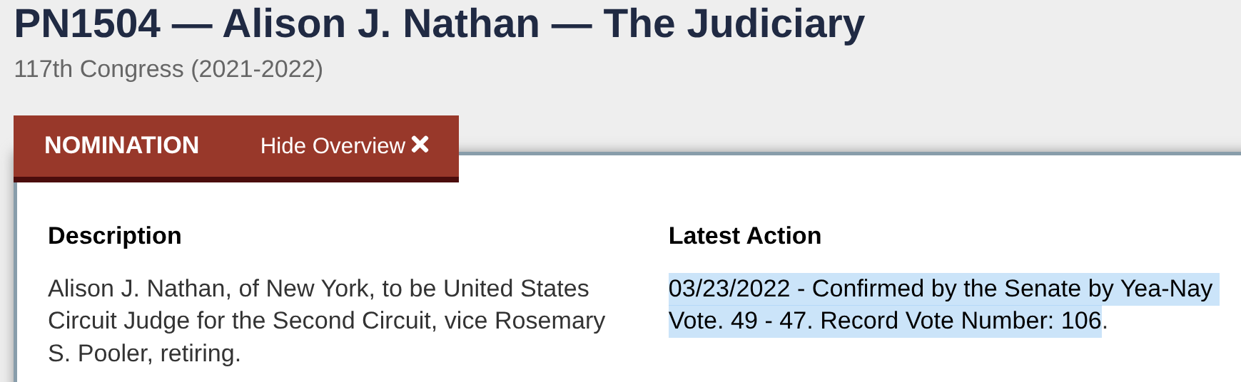 Because Judge Alison Nathan, is about to be promoted by the Senate.